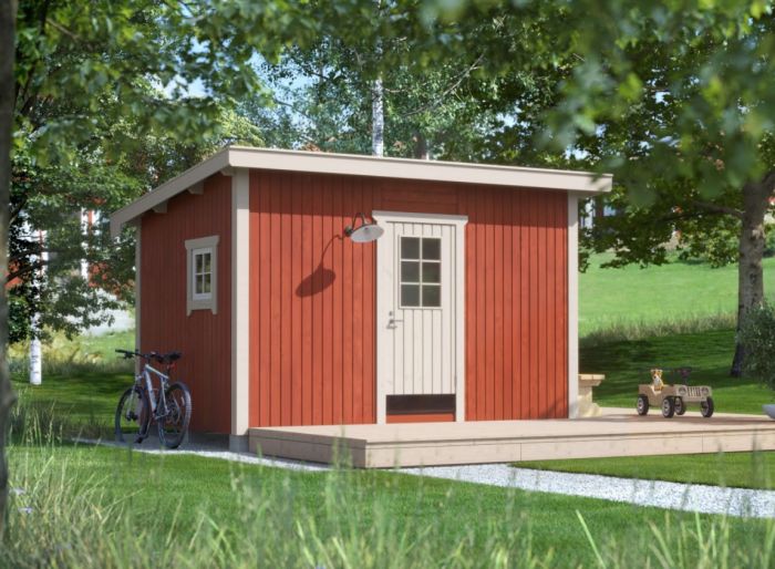 Redskapsbodene er kvalitetsboder som er laget i henhold til sikker nordisk byggetradisjon og som passer fint med de fleste typer bebyggelse. Boden leveres i ferdige seksjoner. Tak, gulvbjelker, takbjelker og bjelkelag er kappet i ferdige lengder. Vindskiver og øvrige detaljer er klare for montering. Samtlige blokker og detaljer er nummerte